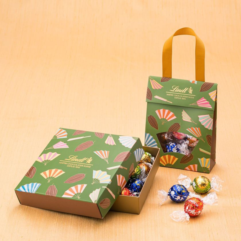 末広がりのおめでたい柄として鎌倉時代以降さまざまな工芸品に用いられてきた伝統的な紋様「扇散らし」に、カカオの実を散らした、リンツならではのデザインです。
