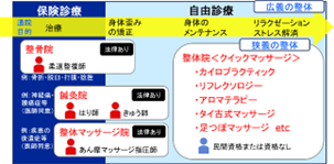 整体業界と一口に言ってもそこには様々な業態が混在しており、整体業界を定義することは難しい。保険診療の領域もあれば、自由診療の領域もある。また、国家資格を要する診療もあれば、民間で開発された診療方法も数多く存在する。当研究会では、「広義の整体」と「狭義の整体」を下図のように整理した上で、それぞれの市場規模を分析し、今後の市場推移を独自に予測した。