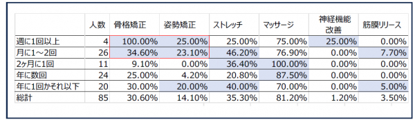 受けている施術の種類は、全体ではマッサージが81.2%と高く、以下、ストレッチ(35.3%)、骨格矯正(30.6%)が続く。しかし、月に1回以上定期的に通院している人に限ると、骨格矯正や姿勢矯正の比率が高かった。
