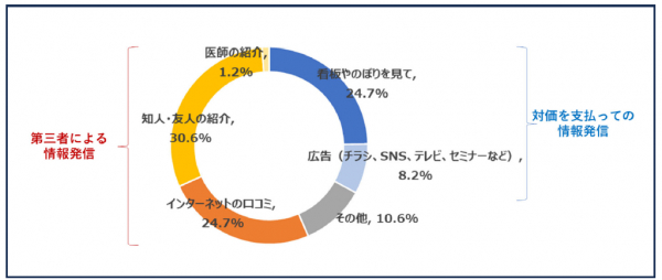 看板・のぼり・広告など施設側のペイドメディア(対価を支払っての情報発信)がきっかけという回答が32.9%、ネットの口コミや知人・友人の紹介などアーンドメディア(第三者による金銭を伴わない情報発信)がきっかけという回答が56.5%だった。