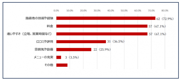 通院先を選ぶポイントとしては、効果に直結する「施術者の技術や経験」が72.9%を占める一方で、「料金」、「使いやすさ」(ともに67.1%)といった継続的に利用できることも選択する上で重要視されている。
