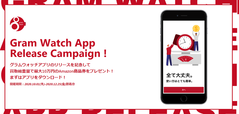 世界初!* 腕時計や懐中時計ならどんなものでも1g1円で換金 はかりに乗せて写メするだけの簡単買取サービス『gramwatch(グラムウォッチ)』 好評につきアプリ化へ リリース記念キャンペーン開催中 *当社調べ