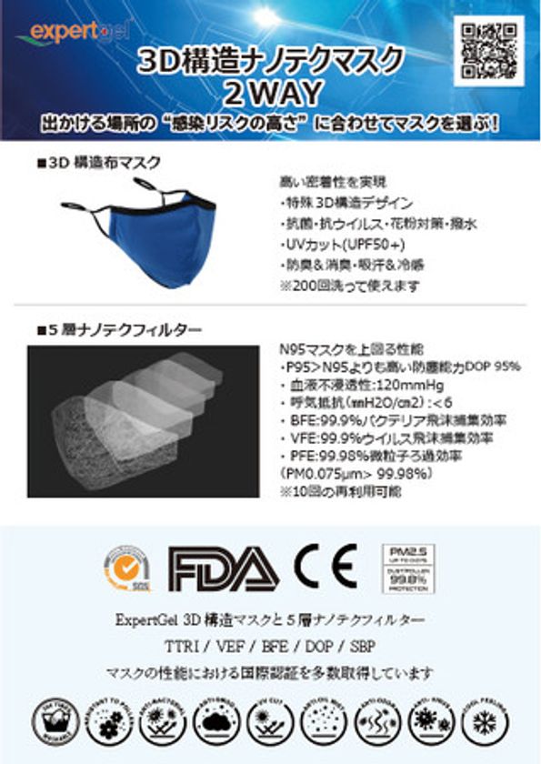 日常生活での利用や花粉対策なら3D構造布マスクだけでもOK!Expert Gelの特殊繊維素材により自分の口臭までも感じません。200回洗え環境保全にも配慮、抗菌効果ももちろん持続します。