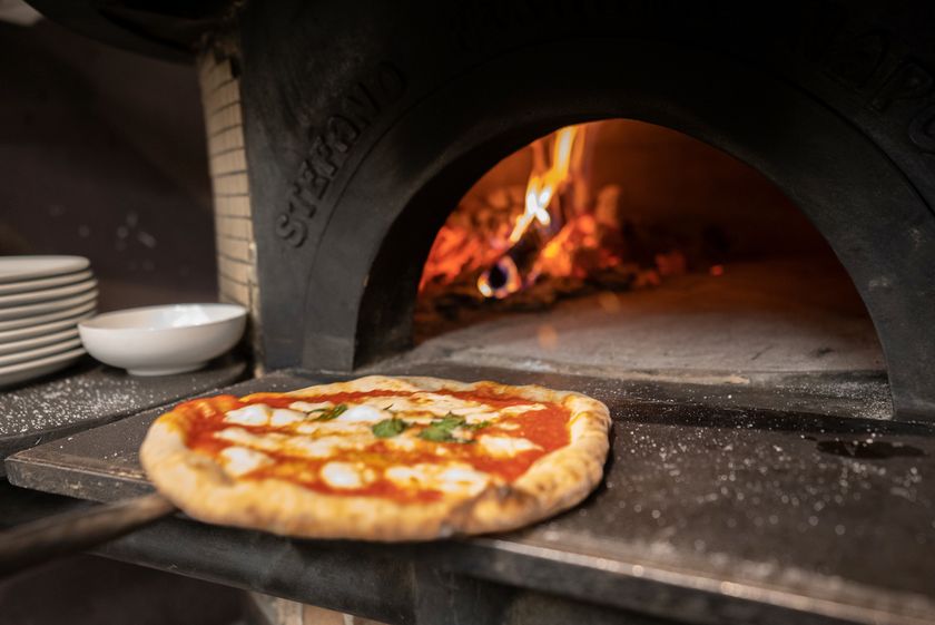 当店ではピッツァを焼き上げるために、イタリア製の薪窯を使用しています。薪窯の特徴は、何と言っても温度が高く、蓄熱性に優れること。窯内部は500度以上の高温を維持することができます。釜の蓄熱により生地の水分を飛ばしすぎることなく、表面から一気に焼き上げ、さらに遠赤外線の熱が生地の内部をじんわりと温め火を通すことから、ピッツァ生地の表面はカリッと、そして中はふんわりと焼き上げることができます。一度に最大で6枚のピッツァを焼くことができますが、当店では厳重な温度管理にこだわり、同時に焼くピッツァは3枚までにしています。