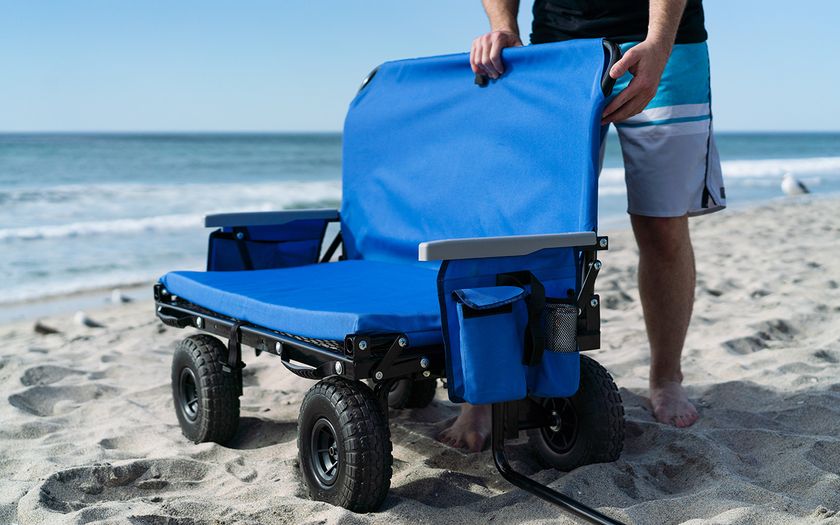 「LOUNGE WAGON」は、巨大パラソル付きでダブルチェアに変換出来る全地形対応の3in1のユーティリティワゴンです。砂、土、砂利、または凹凸のある道路を楽々と進める大型のスポーツホイール仕様でビーチ、湖、公園、スポーツフィールドなどでも、荷物をまとめて運ぶ事が出来ます。また、荷物が多くバッグがたくさん必要なアウトドアでも持ち運び・片付け移動がとっても便利に行えます。「LOUNGE WAGON」自体も折り畳み可能で車のトランクに積み込みや持ち運びにも便利な仕様です。