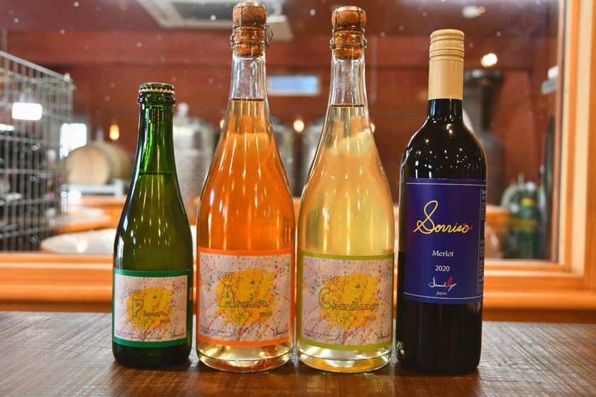 (左から「POP Piccoro」(スパークリングワイン/八戸ワイン)、「POP Arancia」(スパークリングオレンジワイン/日本ワイン)、「POP Chardonnay」(スパークリングワイン/日本ワイン)、「Sorriso 2020」(赤ワイン/日本ワイン))