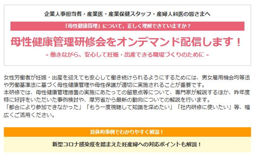 オンデマンド版の内容としては、好評いただきました研修会の内容と同様に、男女雇用機会均等法に基づく母性健康管理措置に関する最新の動向、令和3年7月適用開始の母性健康管理指導事項連絡カード(母健連絡カード)の改正内容や留意点等について説明しています。また、産婦人科医・産業医・社会保険労務士が専門家の立場から、母健連絡カードの活用方法や、妊娠中・出産後の女性労働者の体調管理、職場環境づくりについて解説しています。