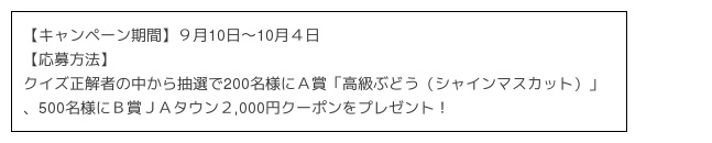 10月2日の「直売所の日」に合わせて、コウケンテツ氏が考案したオリジナルスイーツレシピを紹介し、親子で一緒に学べるクイズを出題。参加者の中から、抽選で秋の味覚が味わえる高級ぶどうや国産農畜産物の購入に使えるクーポン券が当たるプレゼントキャンペーンを実施します。