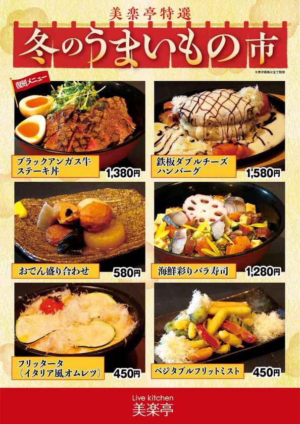 レストラン「美楽亭」の運営会社はホテルや結婚式場を手がけており、旬のこだわり食材を使った料理が自慢のレストラン。スパリゾート内とは思えないような本格的なステーキや定食、麺類、おつまみなど盛り沢山のメニューが楽しめます。今回は心も体もあたたまる「冬鍋」と、冬の旬な素材を集めた「冬のうまいもの市」を期間限定で開催いたします。