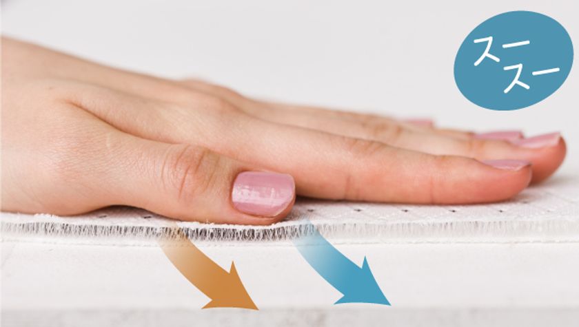 (1) 通気性 :カバーの素材に立体構造を採用。柱が支える通気性の良い3D生地「エアラッセル」を使用。