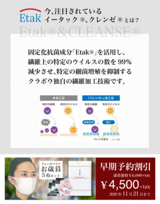 人気の高機能布マスク『クレンゼ(R)マスク』は新型コロナウイルスへの予防効果期待で人気となり、一時ドラッグストアから姿を消すほどでした。『クレンゼ(R)マスク』は、抗菌成分「イータック(R)」を繊維表面に強力に固定する加工技術『クレンゼ(R)』を使用。家庭洗濯50回後も、繊維上の特定ウイルスの数を99%以上減少させることを確認しています。