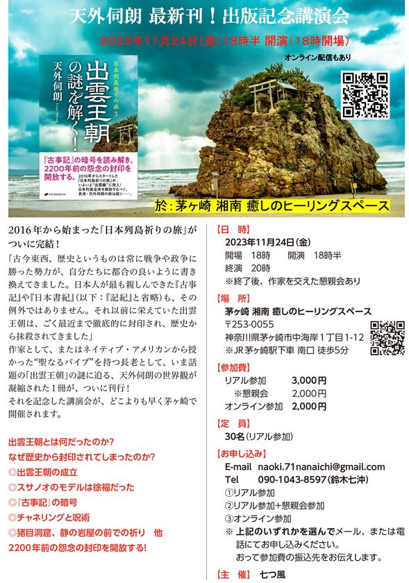 天外伺朗(てんげしろう)の最新刊『出雲王朝の謎を解く!』の出版記念講演会を神奈川県茅ヶ崎市にて11月24日に開催