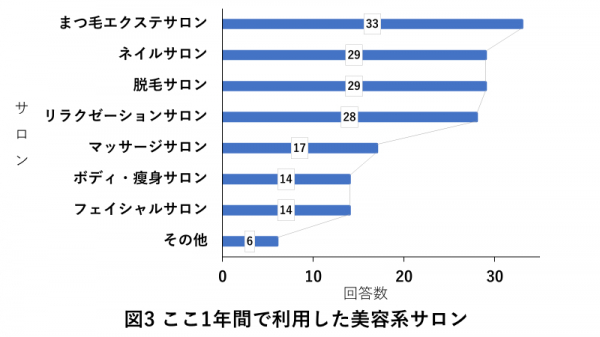 結果、美容系サロンのうち「まつ毛エクステサロン」を利用した女性が最も多く、続いて「ネイルサロン」「脱毛サロン」を利用した女性が多い結果となりました。