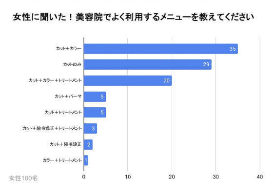アンケート結果から、美容院で女性に最も利用されているメニューは「カット+カラー」であることが分かりました。白髪の目立ちやカラーの色落ちを防ぎ、髪型の印象を整えるために、多くの人がこの組み合わせを選んでいるようです。次いで「カットのみ」や「カット+カラー+トリートメント」の利用が多く、髪の状態やライフスタイルに合わせてメニューを選んでいることがうかがえます。
