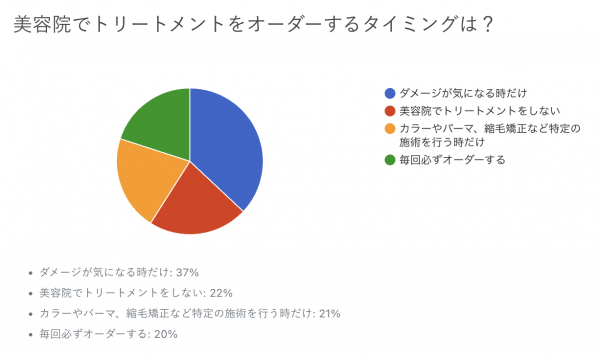 「美容院でトリートメントをオーダーするタイミングは?」の回答は、“ダメージが気になる時だけ”が37%、“カラーやパーマ、縮毛矯正など特定の施術を行う時だけ”が21%、“毎回必ずオーダーする”が20%でした。
