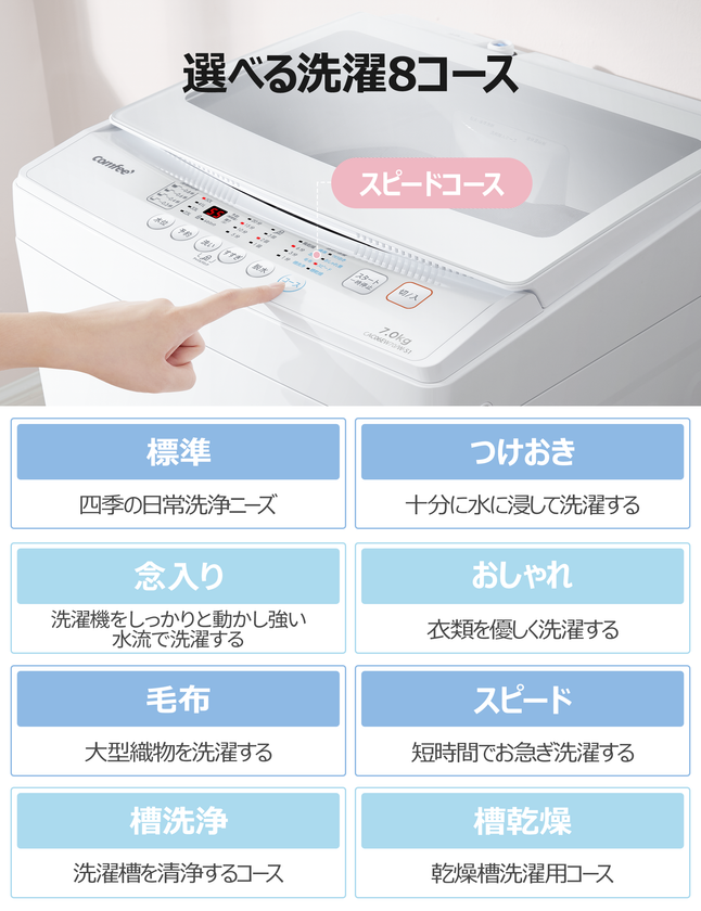 洗濯物の種類によって洗い方を変えたい方のために、COMFEE'の洗濯機は8つのコースを搭載し、標準コースやつけおきのほか、デリケートや毛布洗濯にも対応可能です。さらに、動作音が静かで夜間や隣近所への配慮が必要なシーンでも安心して使用でき、忙しい社会人にとって嬉しいポイントです。洗濯物をムラなくしっかり洗い上げ、どんな汚れでもしっかり落とせるので、日常生活をサポートします。