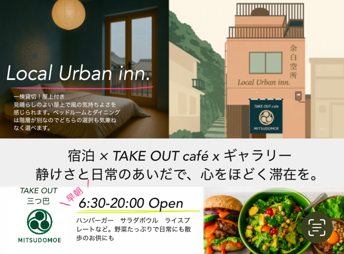 本プロジェクトでは、尾道の歓楽街エリアに位置する三階建ての一戸建てを改装し、1階をテイクアウトカフェ「三つ巴 / MITSUDOMOE」、2・3階を一棟貸切の宿「余白空所 Local Urban Inn」として運営。尾道に「余白を与える新しい選択肢」を提供することを目指しています。