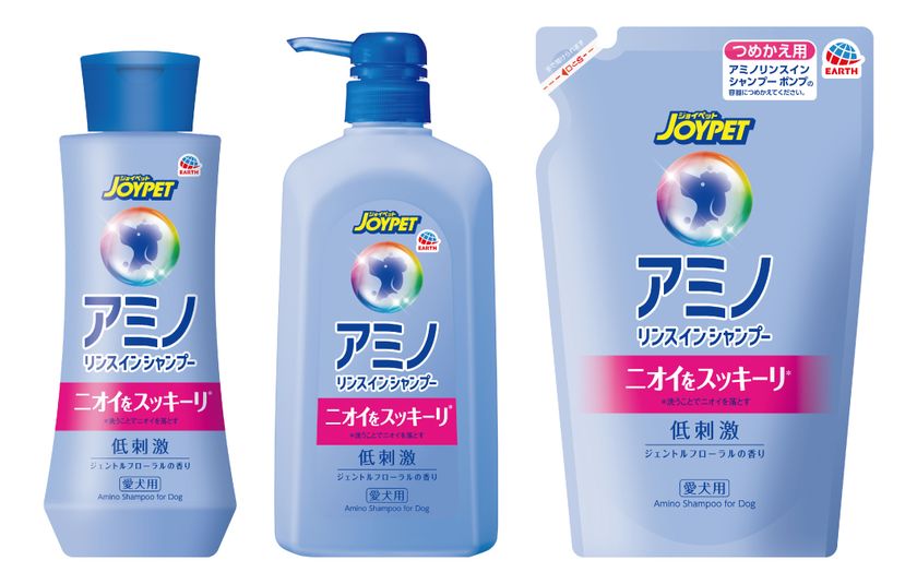 「アミノリンスインシャンプー」は、発売18年目のロングセラーのシャンプーです。化粧品グレードの洗浄成分を使用しており、“泡立ち”や“泡切れ”に優れ、愛犬の「ニオイや汚れをスッキーリ」洗い流します。容器(350mL)も使いやすい形状に改良し、愛犬オーナーがより満足できるシャンプーへリニューアルします。