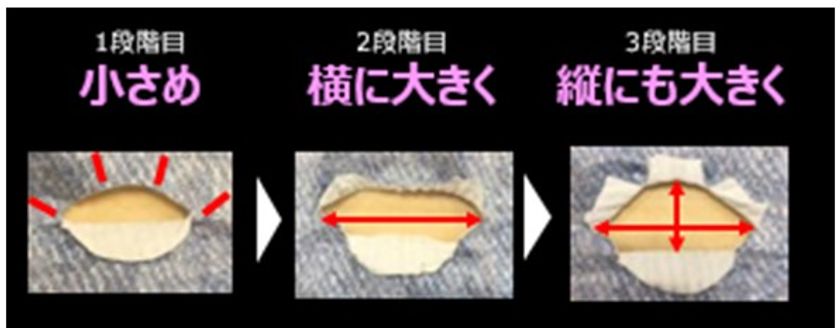 (2) しっぽ穴が小さいようなら、切れ目を広げて穴を大きくする