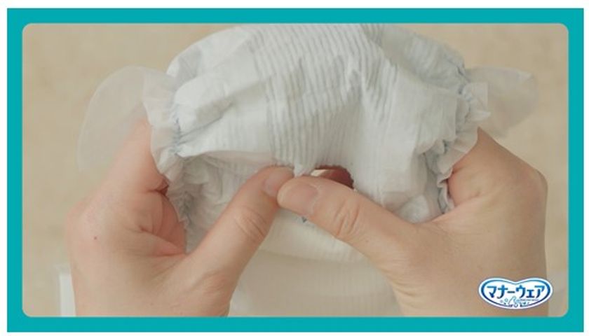 (1) マナーウェアを広げて、内側のギャザーをしっかり広げる