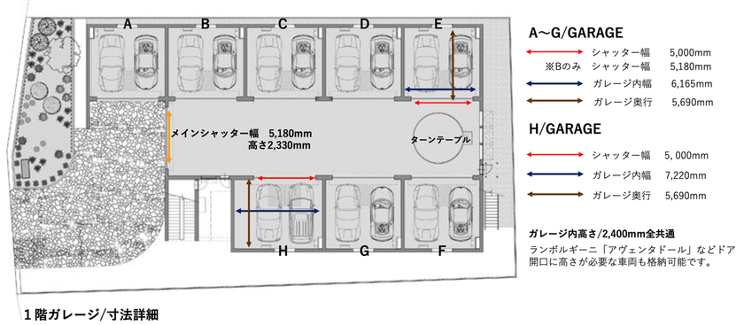ガレージ内の天井高は2,400mmを確保しているため、ガルウィングドア車などのドア開閉に高さが必要な車種や大型車にも充分に対応しています。