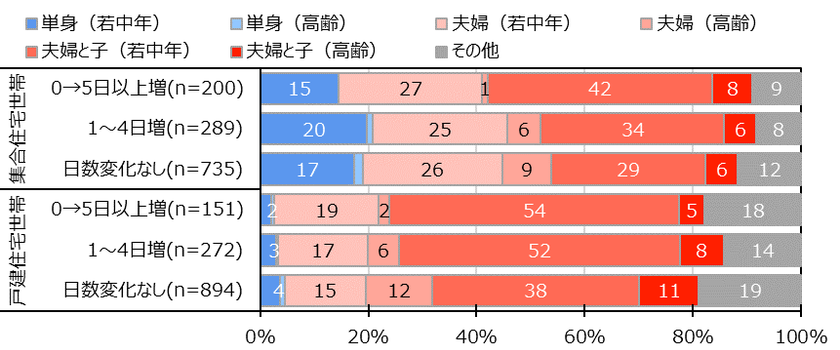 ※ 集合住宅に住む単身世帯の「0→5日以上増」が29サンプルと少ないことに留意。
