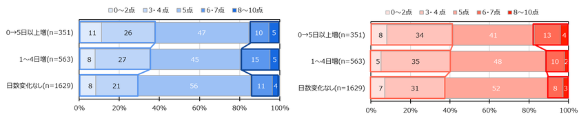 ●在宅勤務日数が増えるにつれて、環境変化に伴う仕事の負担を感じる割合が高くなっている。「0→5日以上増」では、1月以前よりも負担を感じている割合は4割弱となっている。1月以前よりも仕事の負担が減っていると感じている人の割合は、在宅勤務日数の変化に関わらず2割弱となっているが、「1~4日増」では、それ以外の世帯と比べて、負担が減っていると感じている割合が若干高くなっている。(図 5左)