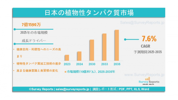 Surveyreportsの専門家による日本植物性タンパク質市場調査の分析結果、2025年の市場規模は7億1590万米ドルに達しました。さらに、日本の植物性タンパク質市場は2035年末までに14億1570万米ドルに達する収益が見込まれております。2025年から2035年の予測期間において、日本の植物性タンパク質市場は約7.6%の年平均成長率(CAGR)で成長すると予測されております。