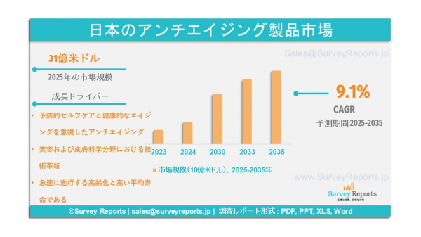 Surveyreportsの専門家による分析によれば、日本のアンチエイジング製品市場規模は2025年に31億米ドルであった。さらに、同市場は2035年末までに69億米ドルの収益に達すると予測されている。日本のアンチエイジング製品市場は、2025年から2035年の予測期間において、約9.1%の年平均成長率(CAGR)で成長すると見込まれる。
