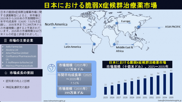 こちらで市場分析の詳細をご覧ください: https://www.kdmarketinsights.jp/report-analysis/japan-fragile-x-syndrome-therapeutics-market/671