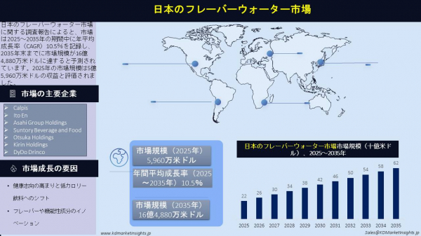 KD Market Insightsは、市場調査報告書「日本のフレーバーウォーター市場の将来動向と機会分析-2025年から2035年」を発表しました。本レポートは、現在の市場動向や将来の成長機会に関する情報を網羅しており、読者が十分な情報に基づいたビジネス判断を下せるよう支援するものです。本調査では、KD Market Insightsの研究者が一次および二次分析手法を用いて、市場競争の評価、競合他社のベンチマーキング、そして彼らの市場参入(GTM)戦略の理解を行いました。
