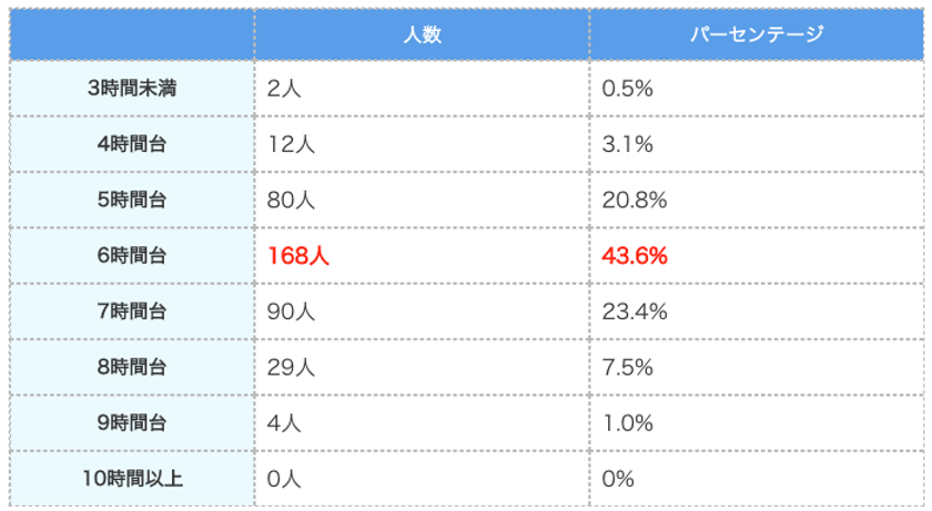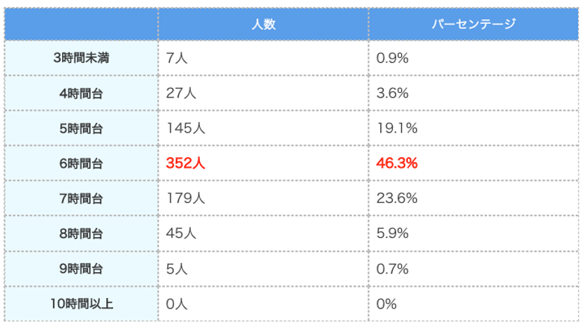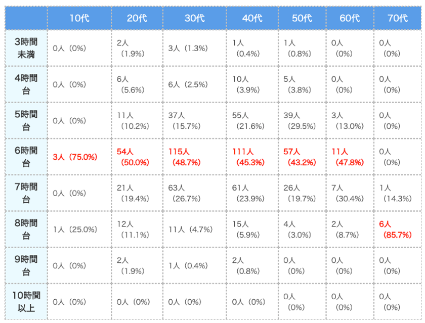 日本人全体の平均睡眠時間を調査したところ、以下の結果となりました。