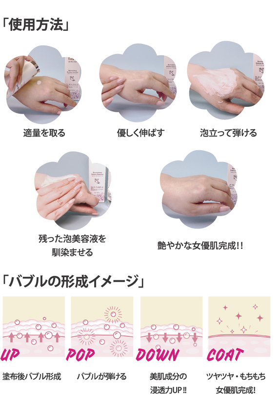泡で出てくるのではなく、肌の上にのせてから体温・空気に反応して自ら発泡するエッセンス仕様です。