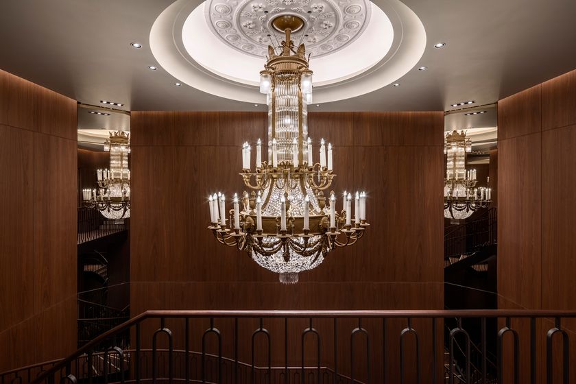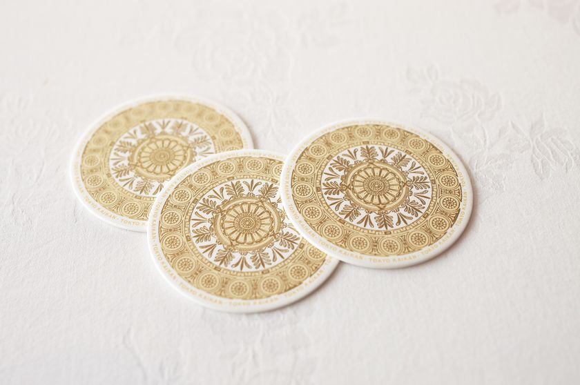 現在、三代目の本舘では螺旋階段上部に設置され、ウエディングのフォトスポットにも使われており、お客様の中には親子三代にわたり大シャンデリアとともに結婚式の記念撮影をされた方もいらっしゃるなど、東京會舘の歴史を見守ってきたシンボルとなっております。また、シャンデリアの吊り元の意匠はメインバーの入口や、箔押しのコースターにも施され、東京會舘を象徴するデザインとなっております。