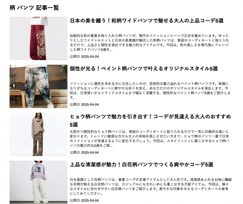 「パターンプレイ」では、柄パンツの選び方や活用方法を盛り込んだ記事を多数ご用意しております。