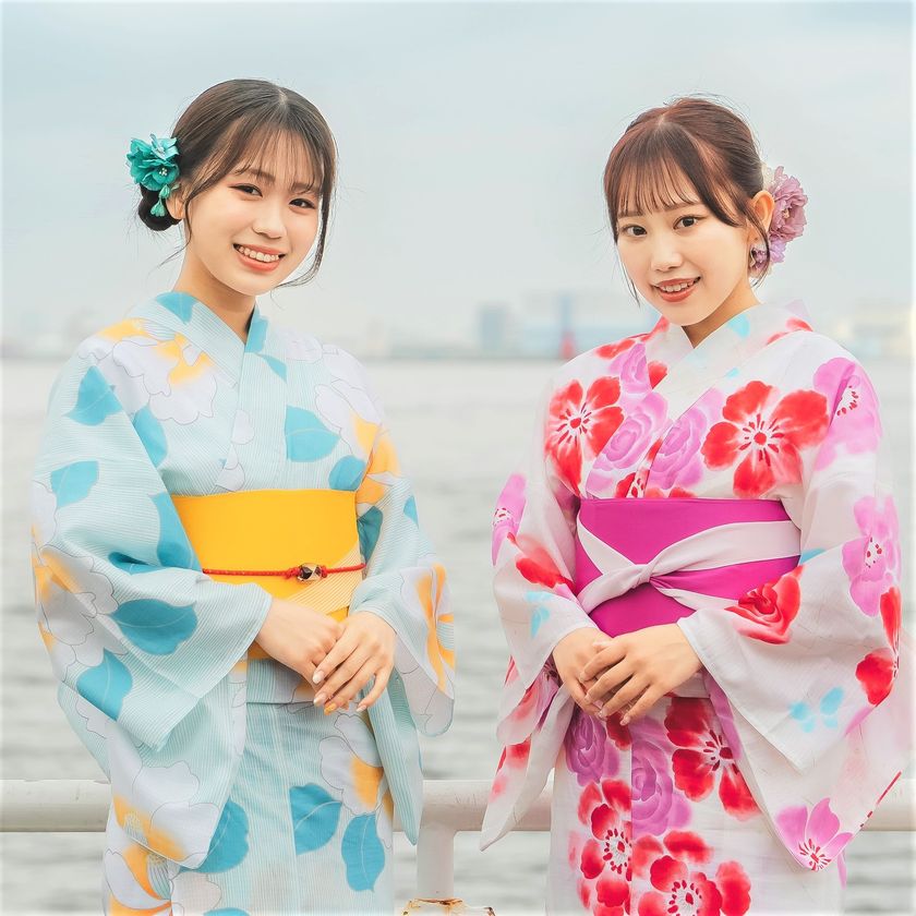 女性用の浴衣は約100枚、男性用はサイズ毎に約10枚のなかから、好きな浴衣・帯・下駄のセットを選べます。様々な色柄を用意しているので、幅広い年代やお好みの方に満足していただけます。浴衣はプロの着付師が着付けますので、初めての方でも安心です。