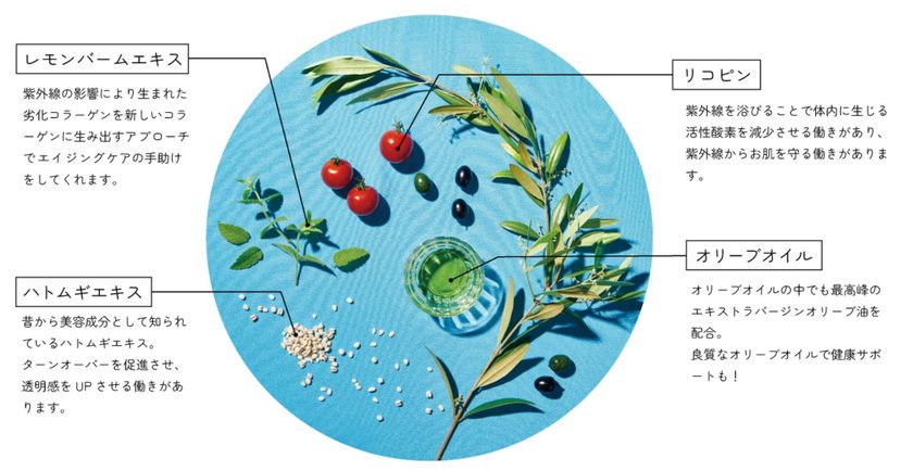 ・「リコピン」「レモンバームエキス」「ハトムギエキス」「エクストラバージンオリーブオイル」植物のチカラで内側からつややかな美しさをサポート