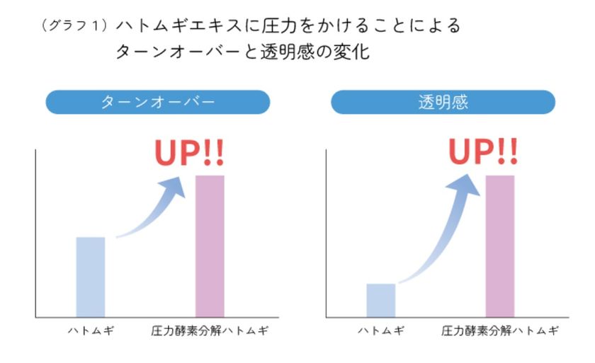 美容と健康の穀物として古くから知られているハトムギエキス。ハトムギエキスと酵素を混ぜ、60MPa(深海6,000m相当)の圧力をかける特殊製法の圧力酵素分解(図1)することで体内において単体で活躍している遊離アミノ酸の含有量が増加し、黄ぐすみの原因となるAGEsの抑制やターンオーバーを高めることが確認されており、肌の透明感をアップ(グラフ1)します。