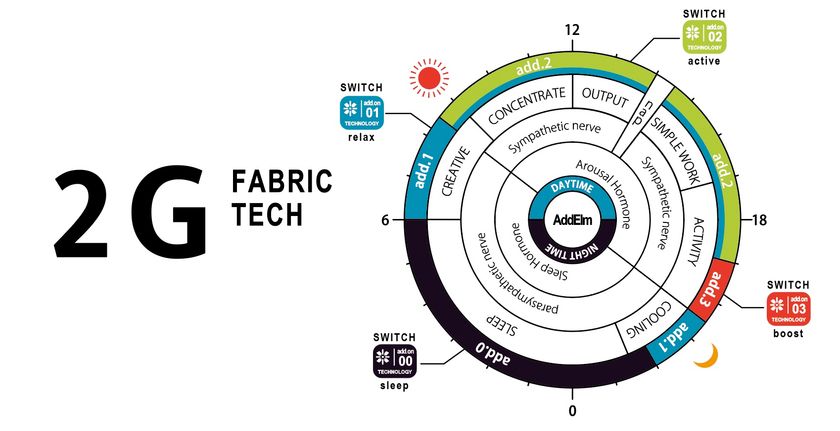 2G fabricsとは次世代の機能素材を指します。従来の吸水速乾やストレッチ、抗菌防臭などの生地の評価試験により定義された素材を1G(1st generation)として、同社AddElmの様に人体生理学を基に開発された素材、または、人体生理試験を行いその影響を評価した素材を2G(セカンドジェネレーション)と定義しております。