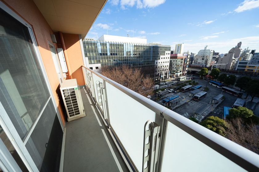 バルコニーから見える目の前の建物が武蔵小杉駅です。