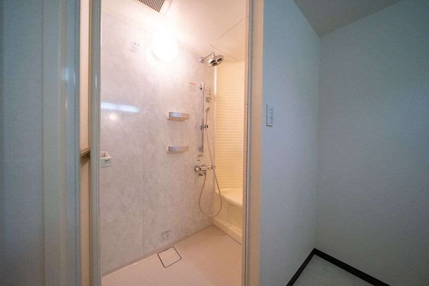 オーバーヘッドシャワー付きのゆったりとしたシャワーブース