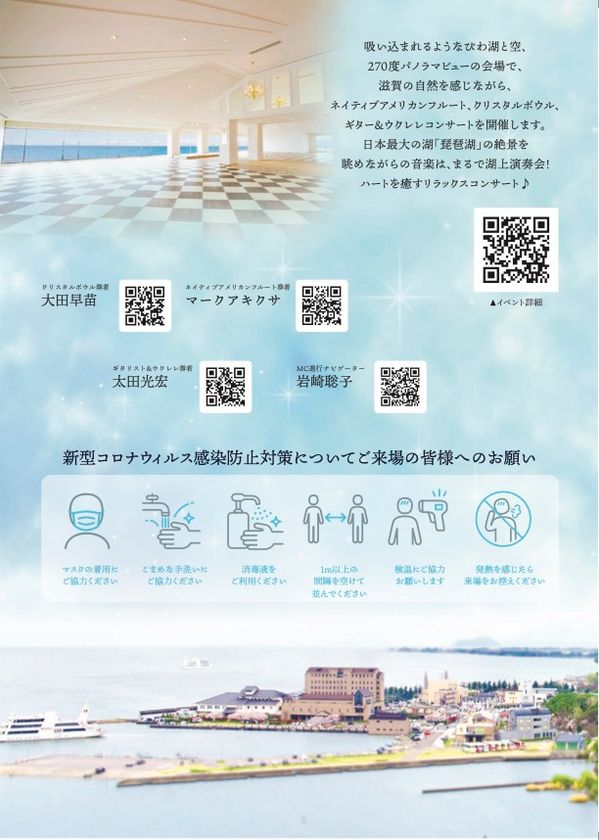 本イベントは、吸い込まれるようなびわ湖と空、270度パノラマビューの会場で、滋賀の自然を感じながら、ネイティブアメリカンフルート、クリスタルボウル、ギター&ウクレレコンサートとなります。日本最大の湖「琵琶湖」の絶景を眺めながらの音楽は、まるで湖上演奏会!ハートを癒すリラックスコンサート。