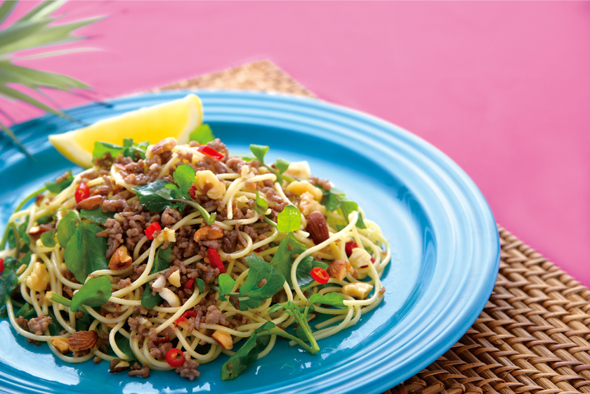 ピパーツ塩使用「クレソンとナッツのアジア風スタミナパスタ」