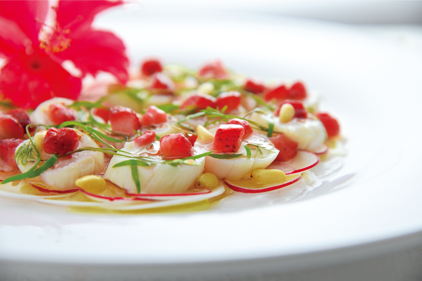 ハイビスカス塩使用「帆立とかぶのいちごソースカルパッチョ」