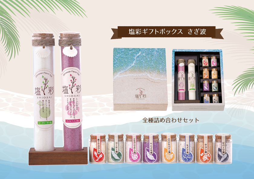 塩彩の豊富なラインナップから、贈り物に人気のギフトボトル(ロングボトル)と、星の砂をイメージしたプチボトルを組み合わせた「全種詰め合わせ」「ロングボトル3本セット」を、波音が聞こえてきそうなさざ波のデザインボックスに詰め込みました。
