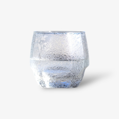 厚みのあるガラスに施された結霜加工が、氷の揺らぎを美しく映し出す。