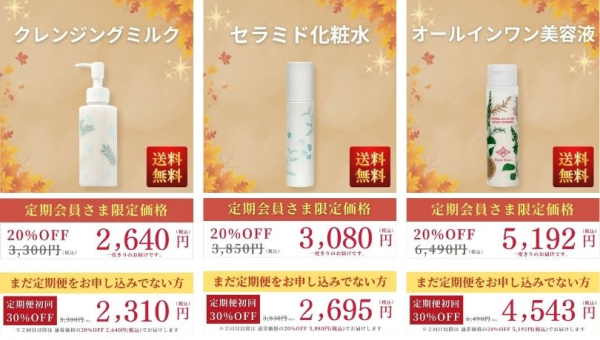 (2)クレンジングミルク、セラミド化粧水、オールインワン美容液の定期便をお申し込みでない方は初回30%offでお申し込みいただけます。