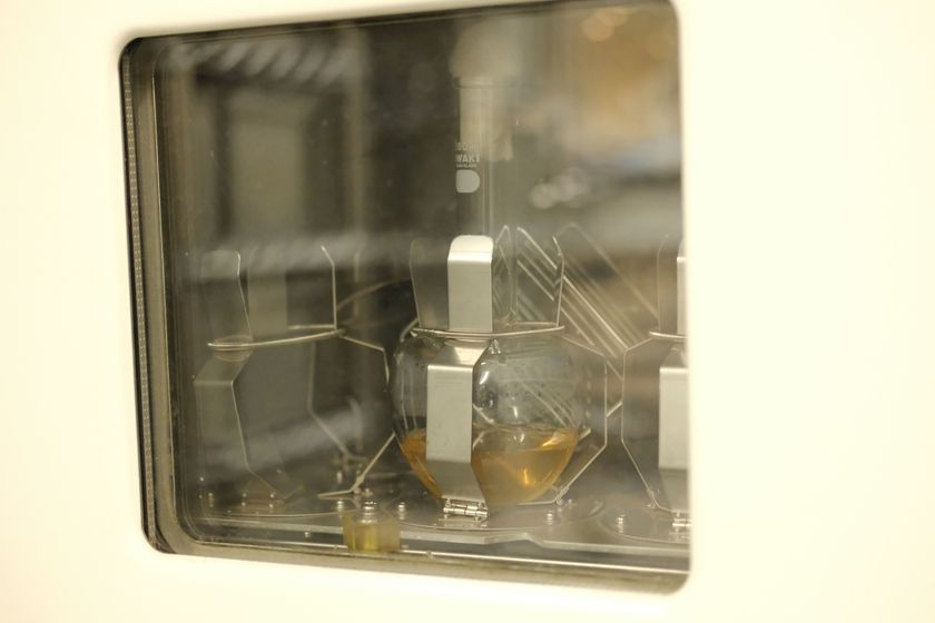 古くから日本の暮らしに活用されてきた植物に着目し、スキンケアなどに生かすため研究開発を積み重ねてきた北麓草水。ディープモイストタイプに新たに配合したモモ果汁発酵液*は、発酵技術を用い、3年の歳月をかけて自社開発した独自の美肌成分です。原料は、北麓草水の工場がある、山梨県特産の桃。収穫までの過程で、キズや過熟のために青果として出荷できないものを使用しています。丸ごと粉砕した桃を搾汁機で搾り、採れた果汁にリポミセスという酵母菌を接種し、培養を繰り返してつくります。発酵の第1段階としてフラスコ培養を行ない、正常に培養できているかを確認しながら、3度のスケールアップを経て、約2週間かけて完成したモモ果汁発酵液は、北麓草水独自の保湿成分です。