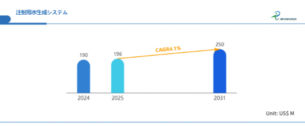 LP Information調査チームの最新レポートである「世界注射用水生成システム市場の成長予測2025~2031」(https://www.lpinformation.jp/reports/572013/wfi-generation-system)によると、2025年から2031年の予測期間中のCAGRが4.1%で、2031年までにグローバル注射用水 (WFI) システム市場規模は2.5億米ドルに達すると予測されている。