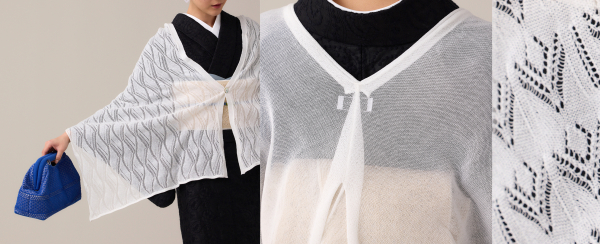 ブランドを象徴する羽織(アウター)は、糸の選定から始まり、編み柄やシルエット、そして袂の収まりを考えたパターン設計など、着物としても洋服としても美しく見える工夫がなされています。着物と洋服、どちらのスタイリングにも寄り添いながら、自分らしいスタイルを楽しむ日々に、そっと寄り添う一着としてご愛好いただいております。
